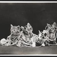 - Black and white photograph of four kittens wearing outfits and playing with yarn.
